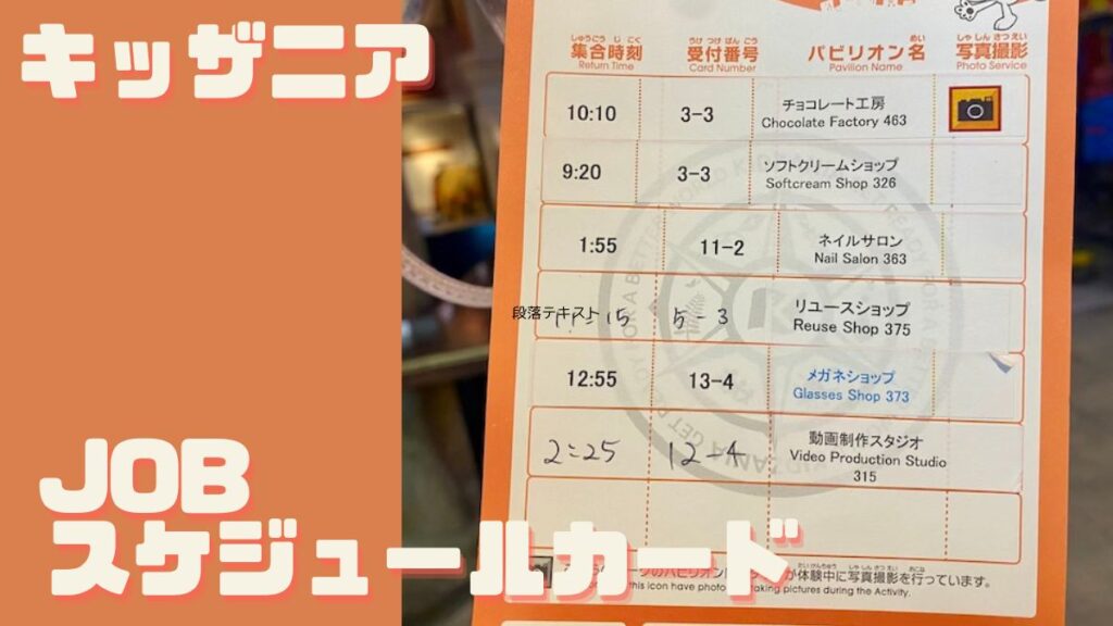 キッザニアでは「JOBスケジュールカード」を使ってアクティビティの予約をします。この予約は最初に選んだアクティビティが終わらないと次の予約が取れない仕組みになっているため、早めに入場して1つ目のアクティビティを早く終わらせることがポイントです。